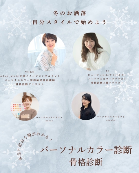 salon_alateは聖蹟桜ヶ丘から徒歩3分。パーソナルカラー診断・骨格診断・顔タイプ診断をもとに貴女の「なりたい」を叶えます。☆話題のファッションカラー48タイプ診断やってます☆